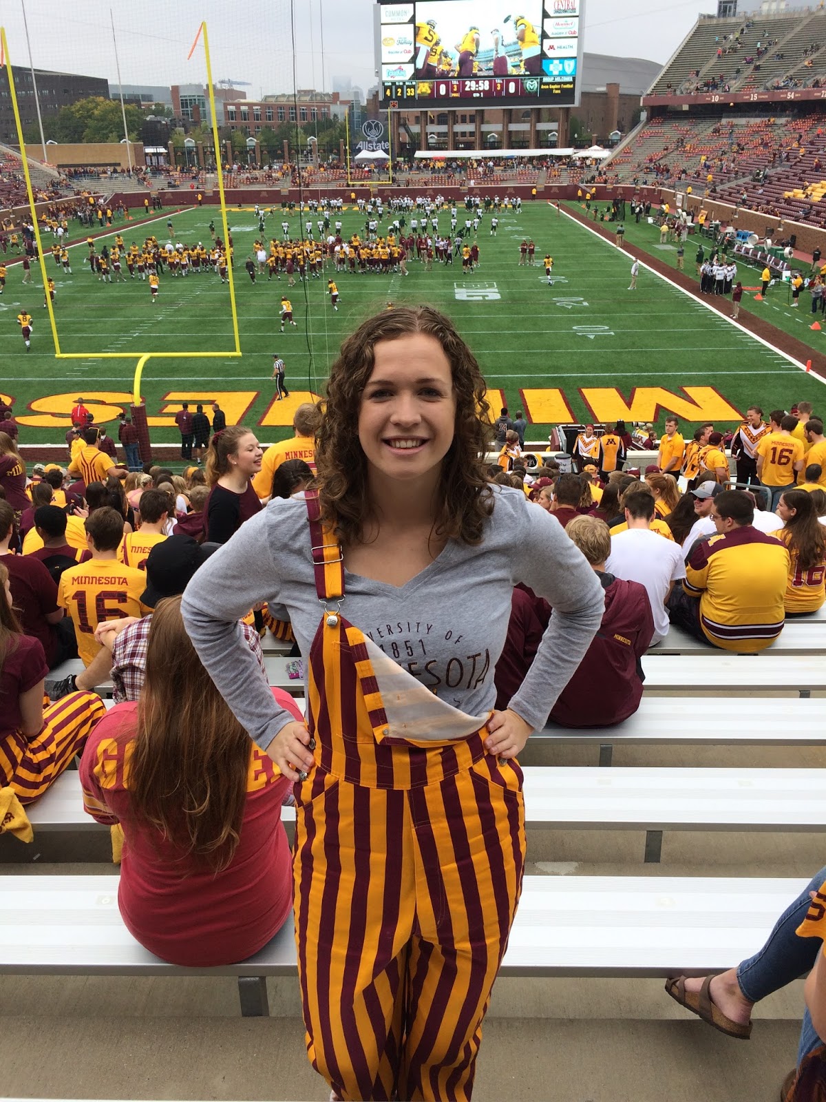 Jeg hadde sesongbillett til amerikansk fotball og prøvde å omfavne studentkulturen på UMN så mye som mulig. Det resulterte i at jeg kjøpte noen "overalls" i skolefargene som omtrent halvparten av studentene hadde på seg: